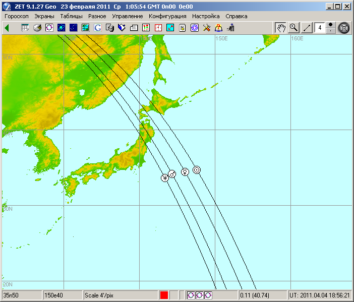 Добавлена опция "RA MC" (Геокарта, Установки астрокартографии, Геодетика) для автоматической установки значения "нулевого меридиана" -RAMC. Скриншот: линии эклиптикальных проекций планет на момент ингрессии Марса в знак Рыб http://zaytsev.com/images/110404.png