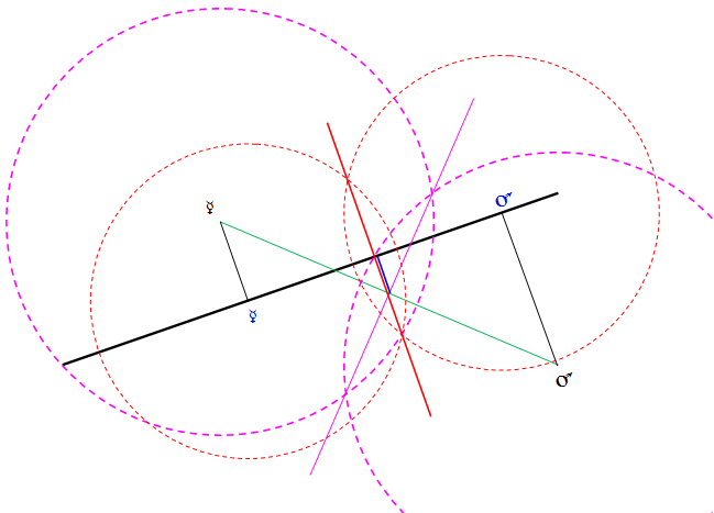 Прямая, проведённая через точки пересечения окружностей (одинакового диаметра), центры которых совпадают с концами отрезка, проходит ровно между их центрами — то есть посередине этого отрезка. Красная и синяя линии не совпадают. А должны, если вам верить: