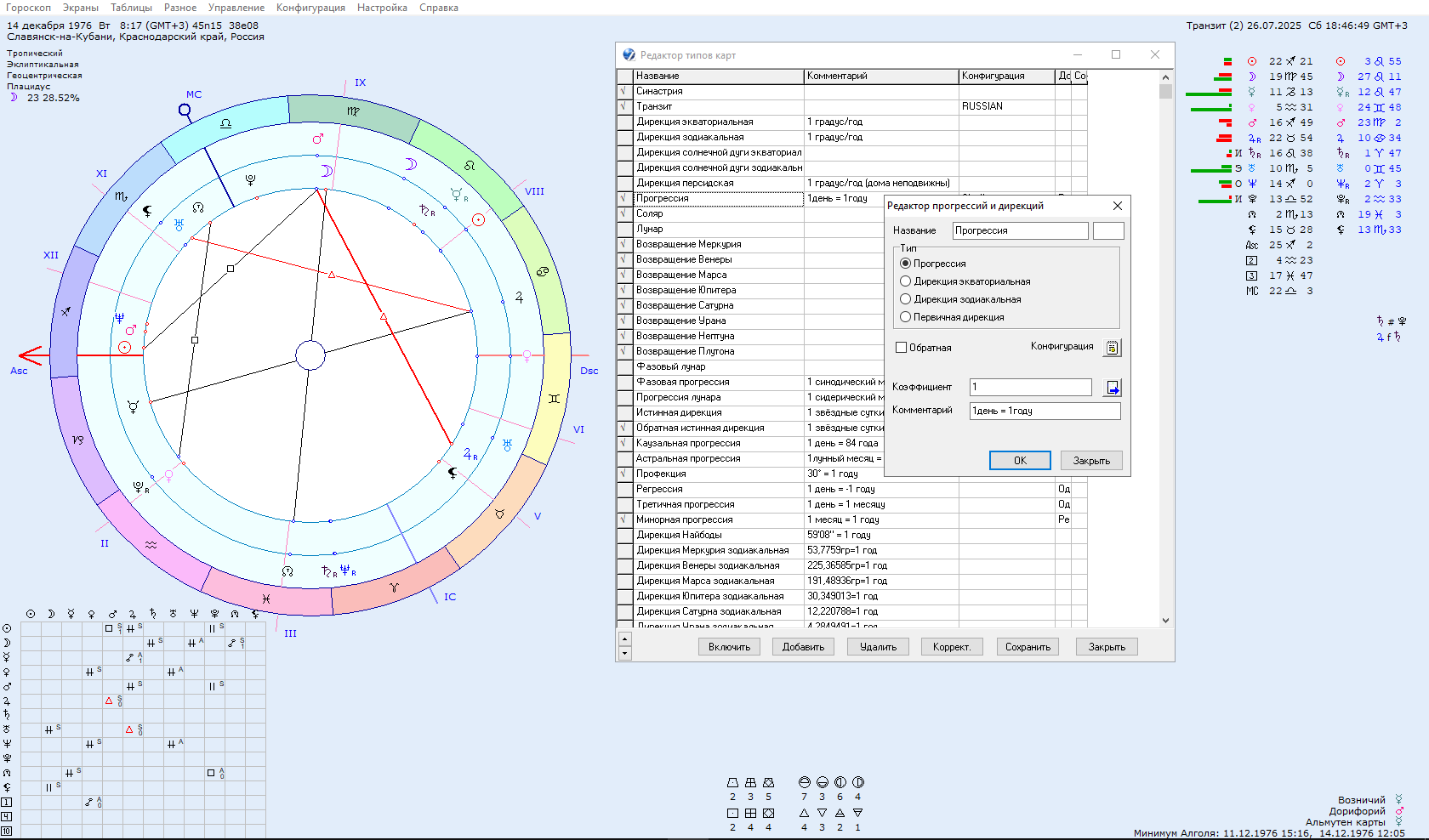 Прогрессии — это методика, отражающая внутренние изменения и эволюцию личности. В ZET 9 Pro вы можете использовать разные типы прогрессий, настраивая не только их скорость, но и направление — прямое или обратное, в зависимости от целей анализа.