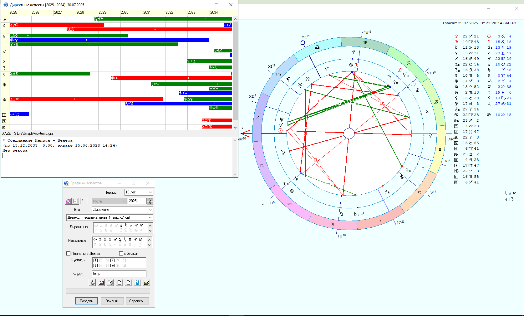 В ZET 9 Pro вы можете не просто анализировать карту в моменте — вы видите, как всё развивается во времени. Программа строит наглядный график — в виде наглядной линии с цветовой маркировкой, символами планет и масштабом, который легко адаптировать под задачу. Хотите заглянуть на 3 месяца вперед? Или проследить цикл на 40 лет? Всё это возможно — график охватывает до 120 лет астрологической динамики.