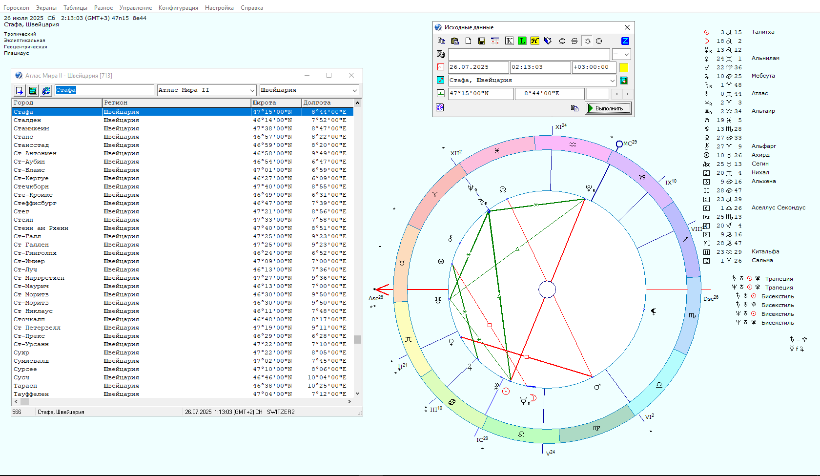 Программа создавалась как полноценная платформа для профессиональной астрологической практики — с глубокими настройками, гибкой визуализацией и точными расчетами, которым доверяют не только астрологи, но и астрономы, преподаватели и исследователи.